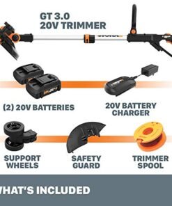 Details: The 2-in-1 GT quickly converts from a trimmer to an in-line wheeled edger and back again. Save your money and don’t buy a separate trimmer and edger. The Command Feed spool system gives you line when you want it at the press of a button. And press all you want because the GT comes with Free Spools for Life! The rubberized wheels provide traction and support for even, professional looking lines when you’re edging. The head tilts 90° so you can trim on uneven patches of lawn. The adjustable spacer guard keeps protects the tops of flowers and plants. And at only 5.3 lbs. you can get your trimming and edging done without feeling fatigue from it. Two powerful 20V Power Share batteries are included with this purchase, which you can use on any tool on the WORX Power Share platform.